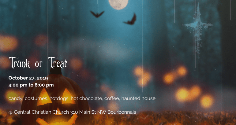9th Annual Trunk or Treat Posted on October 13, 2019November 12, 2019 by Central Christian Church Our 9th Annual Trunk or Treat will take place on October 27th from 4 to 6 pm. Come in costume for candy, refreshments, and fun. Share this: Click to share on Facebook (Opens in new window) Facebook Click to share on X (Opens in new window) X Click to email a link to a friend (Opens in new window) Email Click to share on Pinterest (Opens in new window) Pinterest Click to share on Tumblr (Opens in new window) Tumblr Click to print (Opens in new window) Print More Click to share on LinkedIn (Opens in new window) LinkedIn Click to share on Reddit (Opens in new window) Reddit