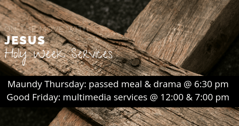 Our services this year for Holy Week will be at 6:30 pm on Maundy Thursday and 12:00 pm and 7:00 pm on Good Friday. Our Maundy Thursday service will be our annual “passed meal” (bring finger foods) followed by a drama. Good Friday’s services will be identical so you can choose the time that is best for you, and will offer a multimedia worship experience of music, readings, video, and more.